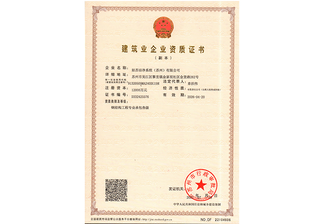 江蘇姑蘇凈化科技有限公司,具有國家電子與智能化工程壹級資質,國家機電安裝工程壹級資質,國家建筑裝修裝飾工程壹級資質 姑蘇凈化科技有限公司,具有國家機電工程施工總承包貳級、國家空氣凈化工程二級資質,國家電子與智能化工程二級資質,國家機電安裝工程二級資質,國家建筑裝修裝飾工程二級資質,消防設施工程專業二級資質企業。